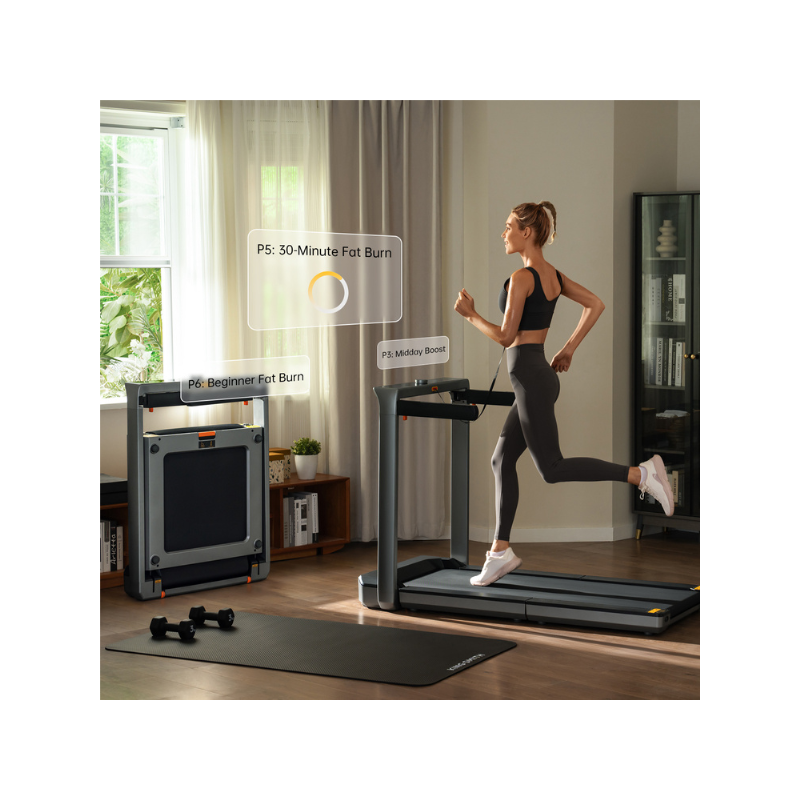 ძრავი: 3 HP [1125W-მდე] ხმაურის დონე: <65 dB ბილიკის წონა: 53 კგ სიჩქარე სიჩქარე: 1 კმ/სთ – 16 კმ/სთ მართვა: პანელიდან ან აპლიკაციიდან სარბენი სივრცე სარბენი სივრცე: 132 სმ × 50 სმ დატვირთვა მაქს. დასაშვები დატვირთვა: 136 კგ დაკეცვა დაკეცვა: 3 ნაწილად იკეცება, ვერტიკალურად დგება | კეცვადი სახელურები | ბორბლებით გადასაადგილებელი უსაფრთხოება Lock Key: უსაფრთხოების გასაღები – ავტომატურად ჩერდება გამოყოფისას Child Lock: პანელის დაბლოკვა შემთხვევითი ჩარევებისგან დისპლეი დისპლეი: LED ინფორმაციული – სიჩქარე / მანძილი / ნაბიჯები / დრო / კალორიები / გულისცემა BLE ინდიკაცია: მთელს სიგრძეზე ფერადი სტატუსის ინდიკაცია გულისცემა: სტრიმინგი Apple Watch-დან დისპლეის ფუნქციები ღილაკები: 3/6/9 კმ/სთ სწრაფი გადამრთველი | სატრიალებელი სიჩქარის კონტროლი | P/M რეჟიმები | NFC თაგი სწრაფი დაკავშირებისთვის | ფერადი სტატუსის ინდიკაცია რეჟიმები P რეჟიმი: 11 წინასწარ განსაზღვრული პროგრამა – სიარული / სირბილი / HIIT / ცხიმის წვა / კარდიო / გახურება | ავტომატური სიჩქარე/დრო M რეჟიმი: სამომხმარებლო – თვითონ ვაწესებთ პირობებს აღმართი აღმართი: არ აქვს კონსტრუქცია მასალა: ნახშირბადოვანი ფოლადი სარბენი ქამარი: 5 ფენიანი სქელი სარბენი სისტემა: 4 ფენიანი – EVA და PET ფენები ამორტიზაციისთვის, მუხლების/სახსრების უსაფრთხოება, კომფორტული ვარჯიში ფეხები: რეგულირებადი რეზინის – იატაკთან ზუსტი მიკრობა აპლიკაცია აპლიკაცია: KS FIT – AI ტრენერი, მორგებული ვარჯიშები, ფიტნეს კონტროლი ინტეგრაცია: Apple Watch | Apple Health ↔ KS FIT სინქრონიზაცია დაცვა გადატვირთვა/გადახურება: ძრავი ავტომატურად ითიშება ავტომატური გათიშვა: ინაქტივთა დროის შემდეგ კომპლექტაცია კომპლექტაცია: ტელეფონის დამჭერი / ლუბრიკანტი ზეთი / ასაწყობი ხელსაწყო / უსაფრთხოების გასაღები ზომები გაშლილი: 77.7 × 154.5 × 105.6 სმ დაკეცილი (3 ნაწილი): 77.3 × 105.6 × 24.6 სმ სარტყლის კორექტირება: მარტივი, მოყვება გასაღები (Hex Wrench)